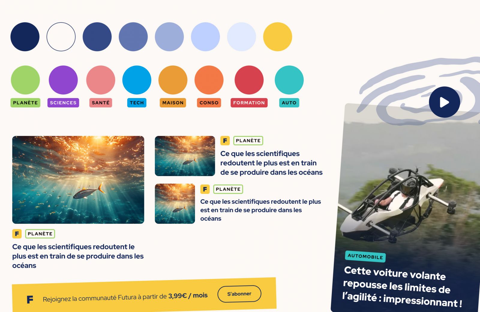 La palette de couleurs, directement inspirée de l'univers scientifique et exploratoire de Futura, renforce la cohérence visuelle sur l'ensemble des supports digitaux. Les visuels et icônes ont été entièrement repensés pour refléter la richesse éditoriale du média, mettre en lumière ses rubriques et incarner sa mission : rendre la science accessible à tous.