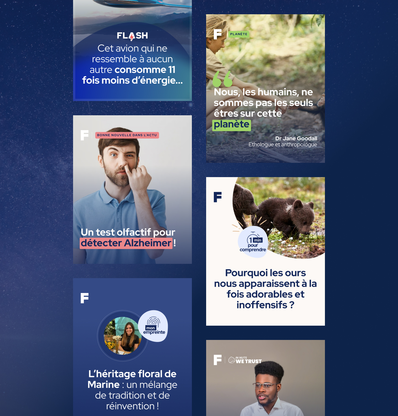 La couleur principale a été repensée pour incarner à la fois la force, la tradition et la confiance, tout en évoquant l’univers de la science, de l’exploration et du cosmos, en parfaite résonance avec l’identité de Futura. La typographie, à la fois moderne, identitaire et cohérente, renforce cette ligne éditoriale. Enfin, chaque publication ou sujet devient une entrée immersive à part entière : « un post = un univers », afin de simplifier la compréhension tout en enrichissant l’expérience.
