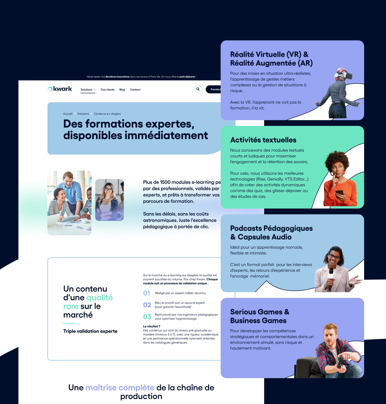 Le design mêle éléments dynamiques, typographies expressives et visuels immersifs, pour créer un univers digital à l’image de Kwark : accessible, inspirant et résolument tourné vers l’avenir de la formation.