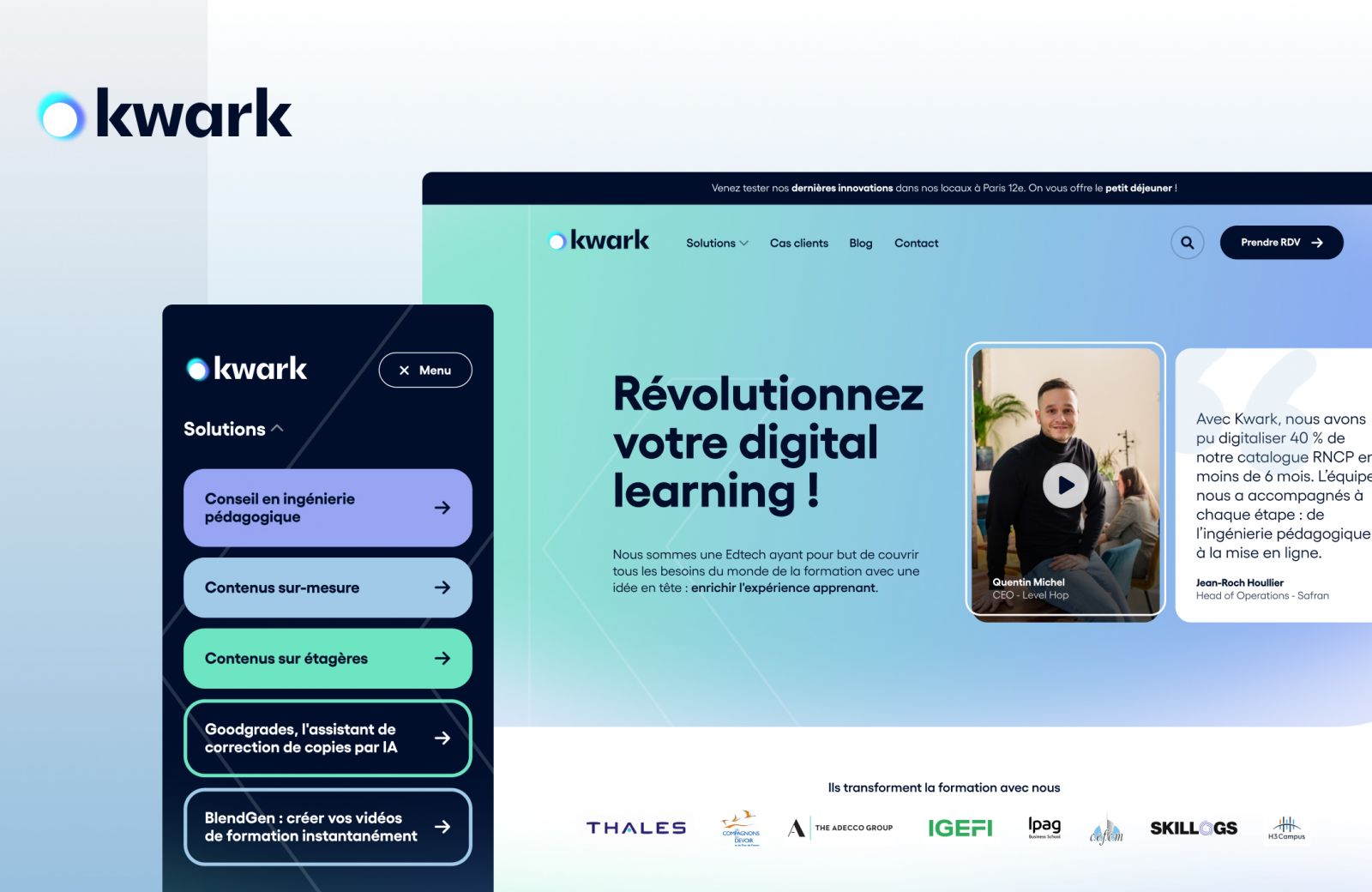 Kwark nous a confié l’harmonisation de son branding et la refonte complète de son site internet, avec pour objectif de refléter son énergie, son audace et son positionnement d’acteur innovant du digital learning.